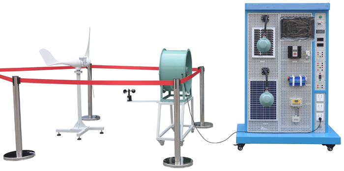 風光互補發電實訓系統主要由光源模擬控制系統、模擬風場系統,風力發電機,風速、風向檢測裝置,風光互補充放電管理系統、離網逆變與負載系統。