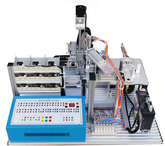 模型底板由10mm厚鋁板加工氧化而成,模型由堆垛機、立體倉庫、搬運機械手、稱重加料機構、傳感器、氣缸等組成;所有機構由有1.2mm優質鋼板加工噴涂制作或鋁材機加氧化而成,堅固耐用。該任務堆垛機有步進與伺服控制,負責物料的出入倉;機械手負責對物料的加料前后的搬運;稱重加料機構對物料進行稱重及加料工作。同時為方便教學,開發了全開放的任務接口盒,盒體由1.2mm優質鋼板加工噴涂制作,面板有鋁板噴涂蝕印沖孔而成,通過并口電纜與智能存儲任務模型連接,以迭插端子形式開放模型接口,方便實訓教學。