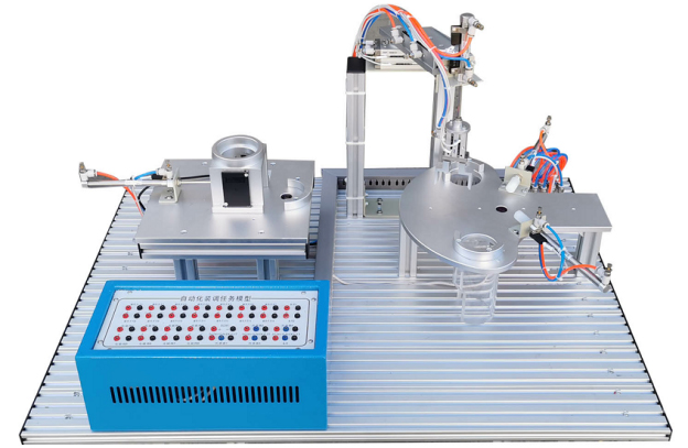 該任務由氣動機械手、分揀機構、上料機構、安裝網孔板、電氣接口板、電磁閥組等組成,安裝網孔板由有1.2mm優質不銹鋼鋼板加工制作,機構件由鋁材機加氧化而成,機構全部為散件提供,按教學要求由學員自己動手組裝、接線并通過接口板與外部連接調試。