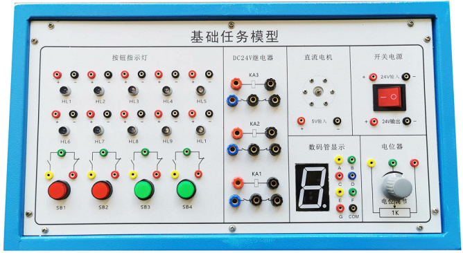 該任務盒有1.2mm優質鋼板加工噴涂制作,面板有鋁板加工沖孔而成,表面貼膜制作,配置有直流電機、7段數碼管、彩燈組、繼電器組、按鈕組、電位器等,能滿足對PLC教學基礎任務指令的學習與應用。