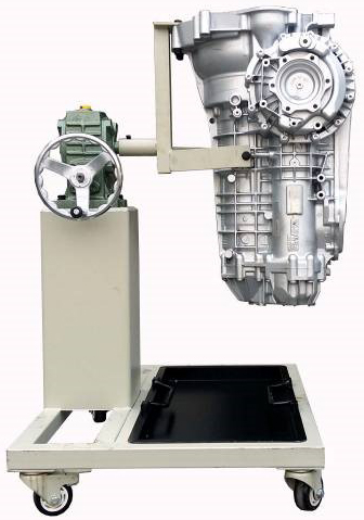 采用減速翻轉(zhuǎn)機構,可使變速器旋轉(zhuǎn)任意角度,并能任意位置鎖止,便于學生從不同的角度進行拆卸和裝配。