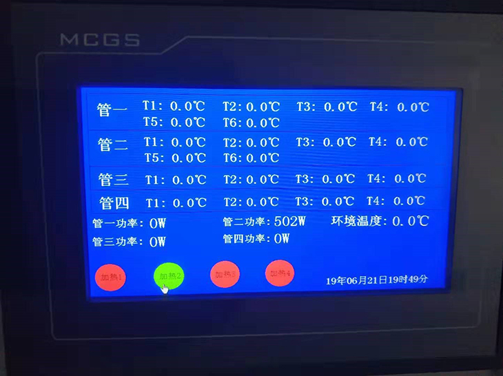 配有四根不同長度和直徑的電鍍紫銅管,管內設置電加熱器;每根管子的表面裝4~6支測溫傳感器,以測定其表面平均溫度,測溫傳感器采用進口DS18B20;每根橫管電加熱器配備電子集成固體調壓模塊無機調節。測試儀表箱設有(每根橫管電加熱器)數顯功率表;所有測試數據由7寸觸摸屏同屏顯示,不銹鋼實驗支架。